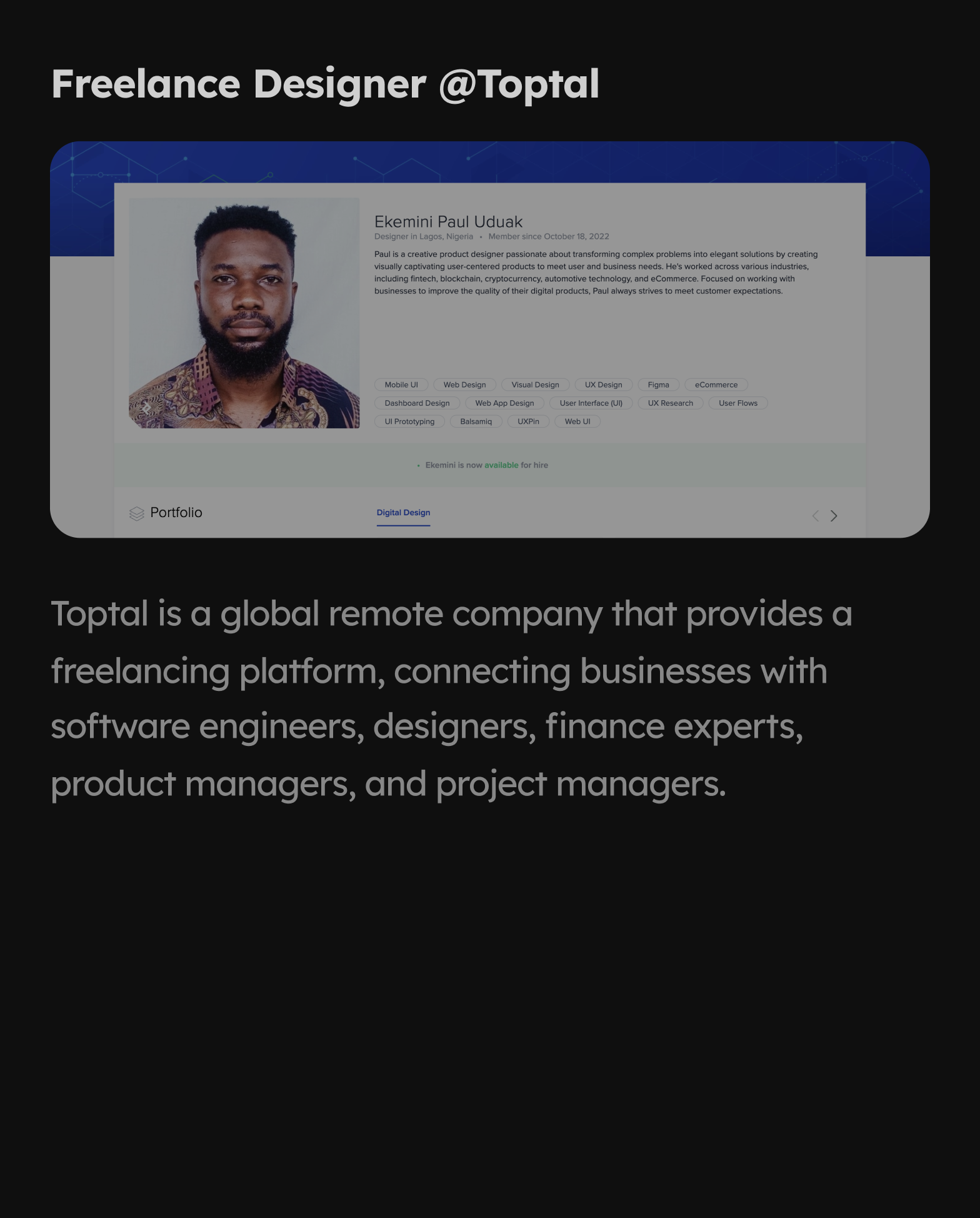 Transforming your ideas into visually stunning and user-centric products. Look no further! Ekemini is a seasoned product designer with a passion for turning concepts into captivating realities.